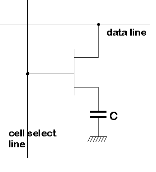 The alternative is dynamic RAM which uses a very simple single transistor memory cell in which the data is stored on the gate of an MOS transistor. This charge turns the transistor on if it is present thus making it possible to read the data. The main problem is that the charge leaks away slowly and data will be lost if it is not refreshed periodically (typically every 2ms). The process of reading the data also refreshes it, so effectively every bit of memory must be read every 2ms.