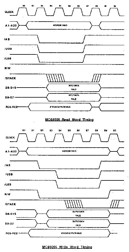 The asynchronous bus works using two control signals in the same sort of handshaking arrangement that we saw using the VIA. If we take a memory write cycle as an example; the-processor sets R/W low to indicate a write cycle, sets the address on the address bus and the data on the data bus. The AS (address strobe), UDS (upper data strobe) and LDS (lower data strobe) all go low to indicate valid data on the address bus, and on both halves of the data bus. The processor then waits for a low signal on DTACK (data transfer acknowledge) which is generated at by the memory device when it has received and latched the data. The processor proceeds on the following clock pulse. A transfer like this can take anything from 4 clock cycles upwards depending on the speed of the memory. The clock rate depends on the version of the processor 4,6,8,10,12.5 and 16 MHz versions have been made. The 'standard' at present is 10MHz so each clock period is 100ns.
